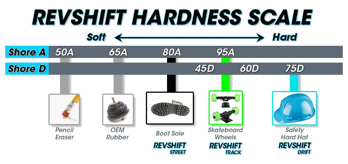 95A Track (Green): Significantly stiffer and stronger than OEM rubber. Noticeable increase in NVH. Excellent for enthusiastically driven street and track cars.